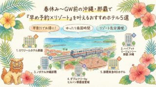 春休み〜GW前の沖縄・那覇で「早め予約×リゾート」を叶えるおすすめホテル5選を比較表つきで紹介。ロワジール、瀬長島、ハイアット、アクアチッタ、逸の彩(ひので)を温泉・プール・朝食・立地で分かりやすく整理し、タイプ別の選び方と混雑回避のコツも解説します。