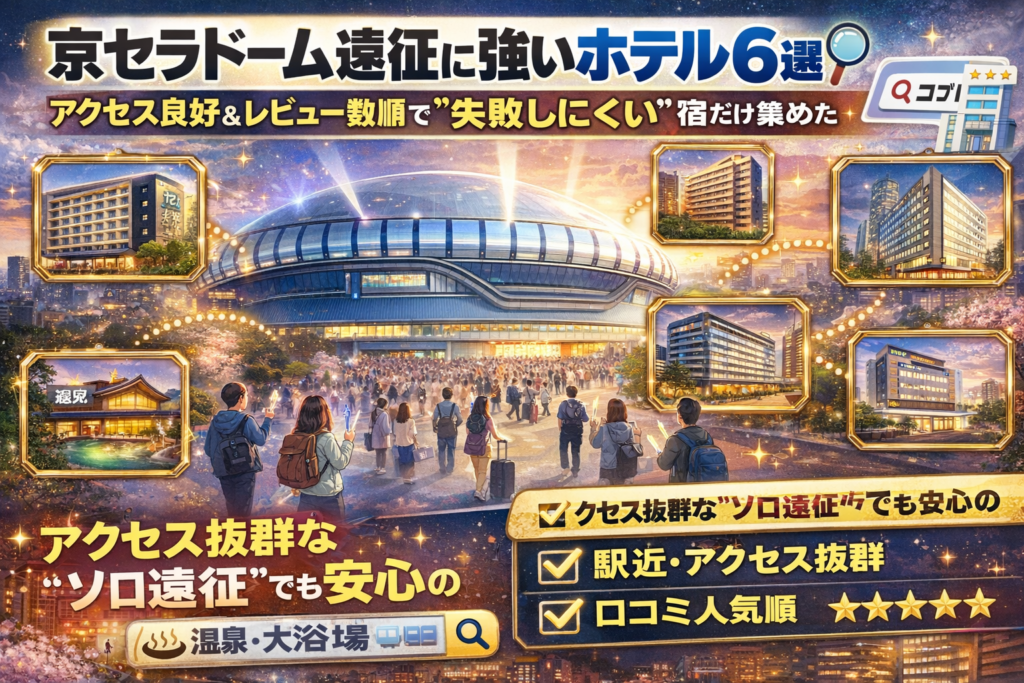 京セラドーム大阪のライブ遠征に向けて、アクセス良好でレビュー数が多い“失敗しにくいホテル”を6軒厳選。天然温泉・大浴場・眺望・駅近など遠征目線で比較し、終演後の「移動→風呂→睡眠」をラクにする選び方も解説します。